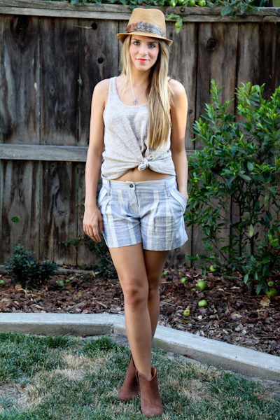 Top Urban Outfitters, Shorts BCBG, Hat Juicy Couture, Booties Asos, Necklace Jeweled by Alyssa, Lip color Loreal Volcanic