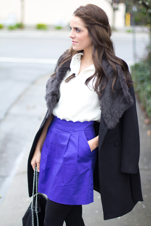 Coat c/o Queen’s Wardrobe, Blouse J. Crew, Skirt J. Crew, Tights Forever21, Pumps Zara, Purse Stella McCartney