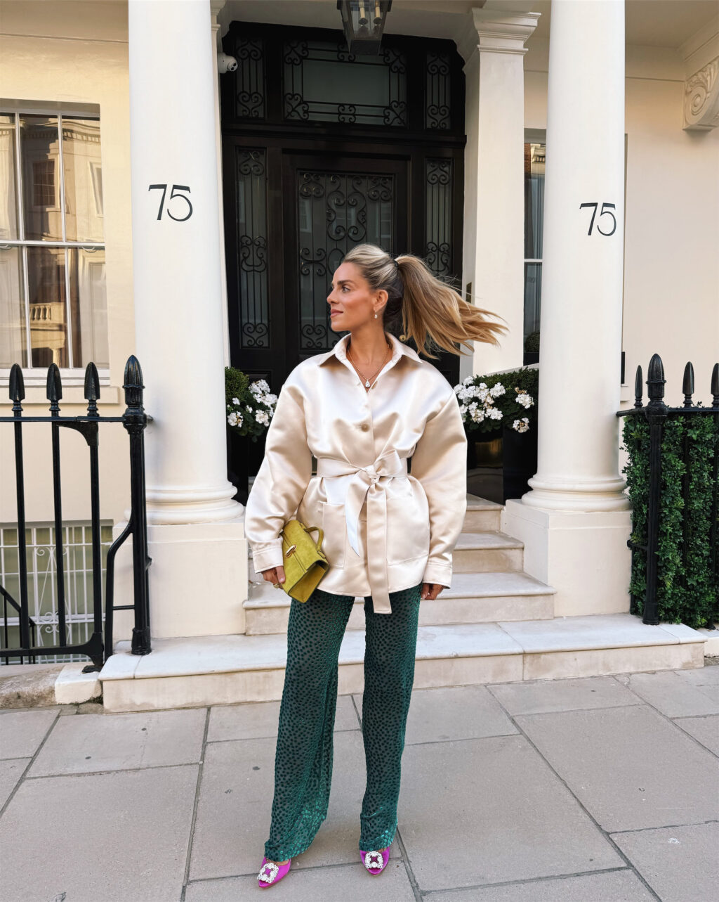 Oct 2025 Daily Look No. 304 Attersee Jacket, Dries Van Noten Pants, Manolo Blahnik Pumps, Savette Bag, Arielle Ratner Necklace, Tiny Gods Earrings