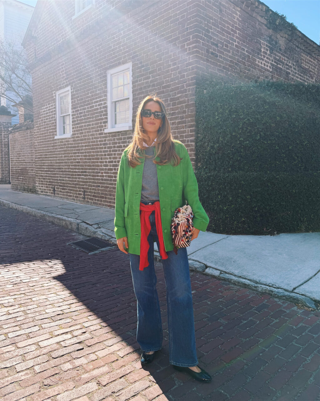 Staud Jacket, The Row Shirt (old, similar here), Sea NY Sweater (old, similar here and here), Guest In Residence Red Sweater (old, similar here), AYR Jeans, Dior Sunglasses, Loewe Clutch (similar here), Chanel Flats (similar here)