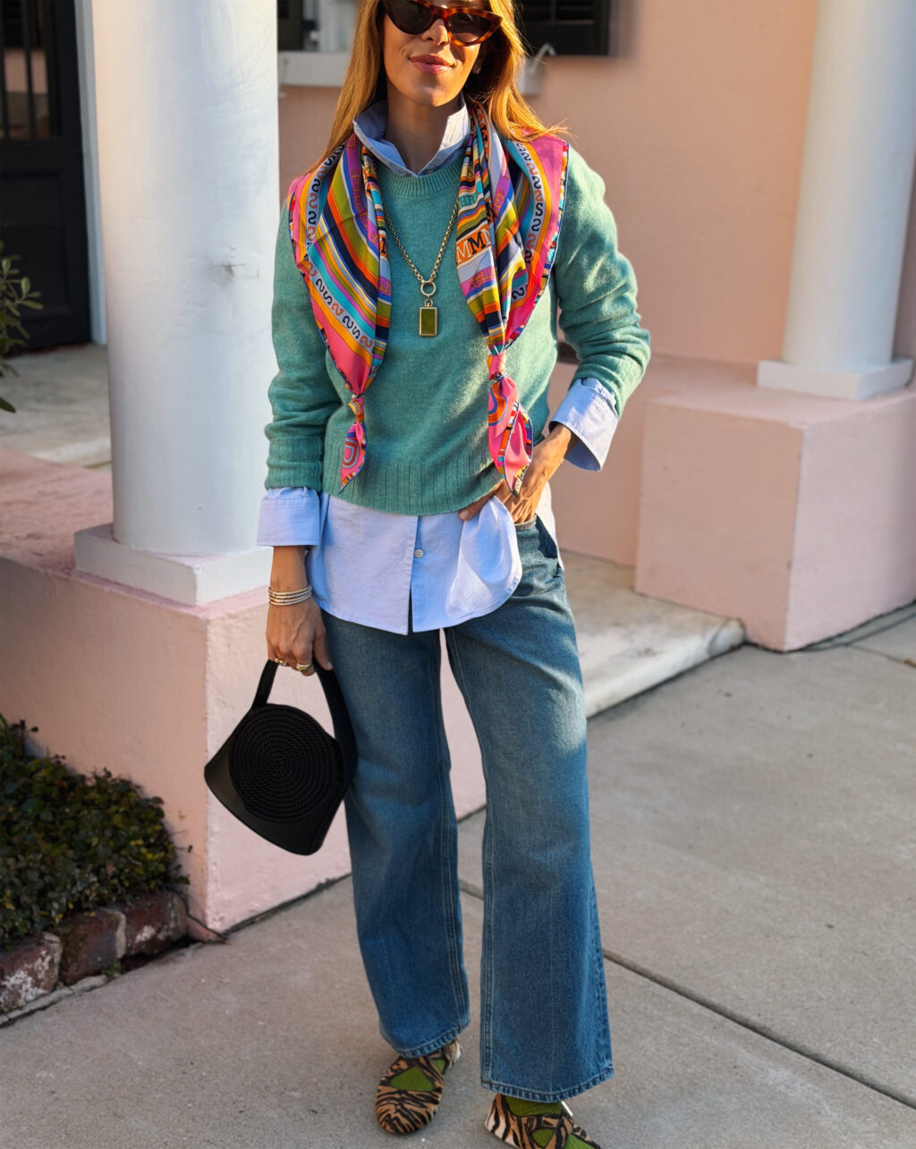 AYR Shirt, Guest In Residence Sweater, House of Dagmar Jeans, Alaia Flats, Comme Si Socks, Destree Bag, Hermes Scarf (similar here), Sherman Field Necklace (sold out, similar here)