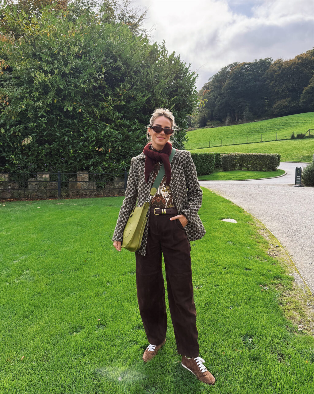 Gucci Jacket, Cara Cara Turtleneck, &Daughter Scarf, Co Pants (similar here), Prada Sneakers (less expensive here), Jacque Marie Mage Sunglasses, Hermes Bag (similar here & here), Anderson’s Belt