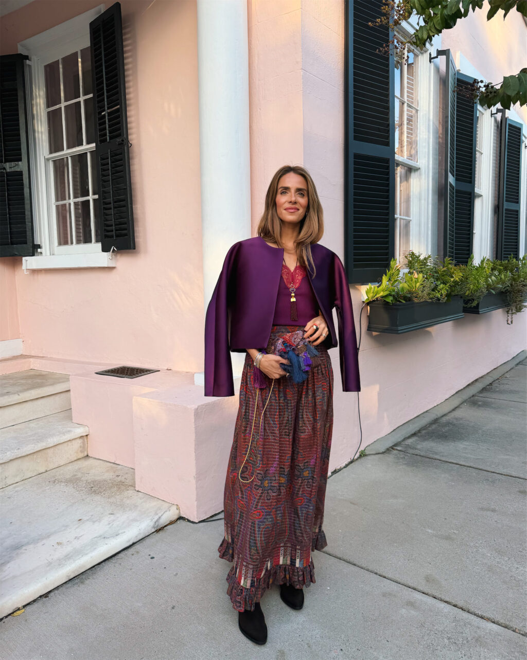Oct 2025 Daily Look No. 332 Leset Jacket (more sizes here), Saint Laurent Tank, Valentino Skirt, Dries Van Noten Clutch, Partlow x Adam Lippes Boots