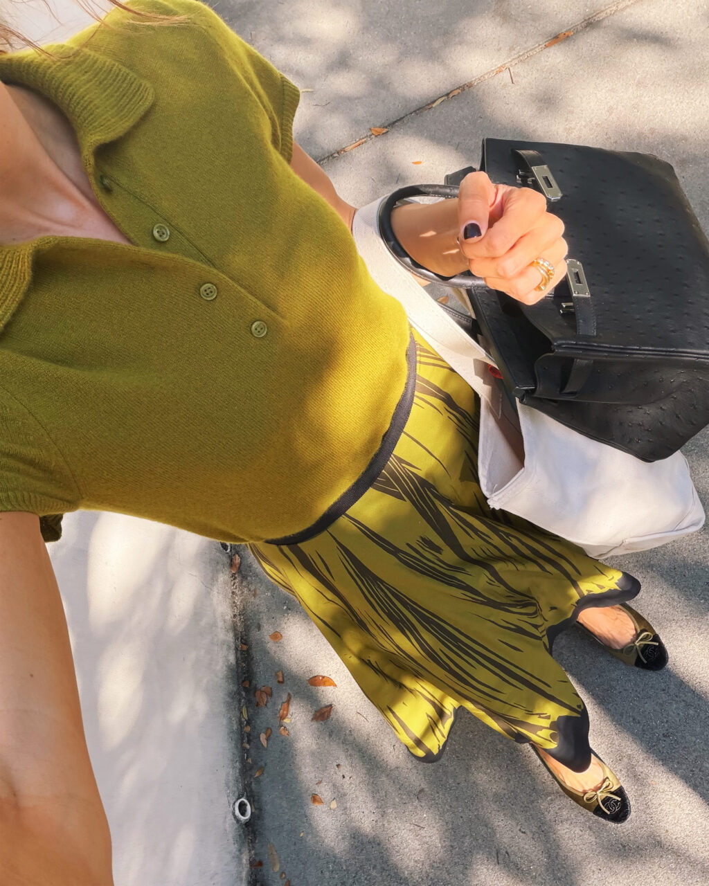 Nov 2025 Daily Look No. 336 Simkhai Sweater (sold out, similar here), Giambatista Valli Skirt (old, similar here and here), Chanel Flats (similar, less expensive here), Hermes Bag (similar here)