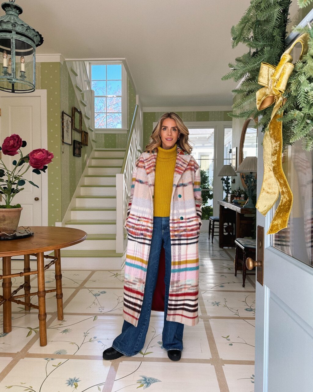 Dec 2023 Daily Look No. 270 Outfit Details: Missoni Coat (old, similar here), Wiggy Kit Sweater, AMO Jeans, Chanel Boots