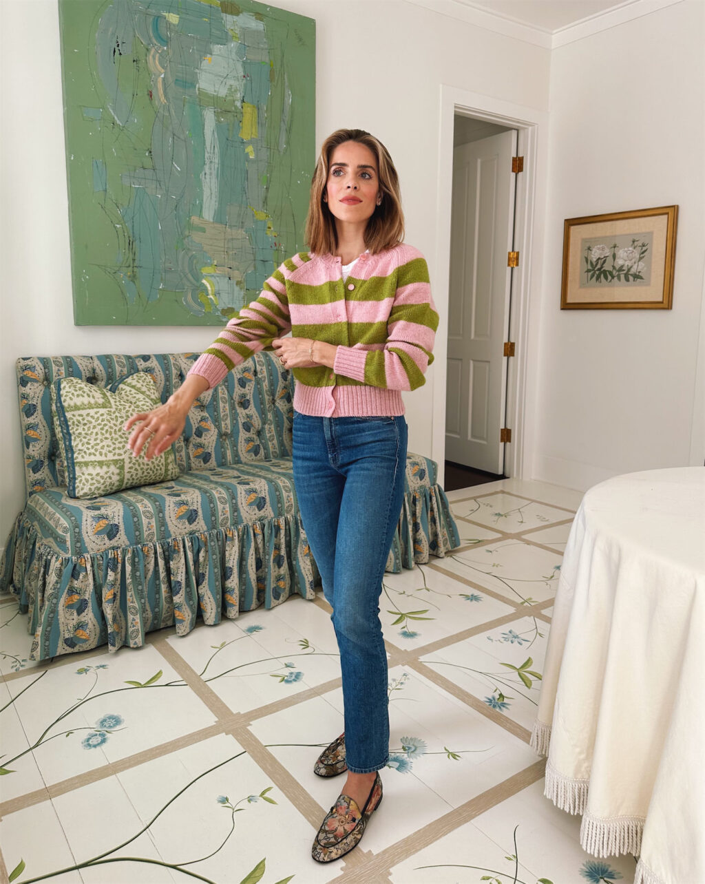 Feb 2023 Daily Look No. 24 Outfit Details: Molly Goddard Cardigan, James Perse Tee, Mother Jeans, Gucci Loafers