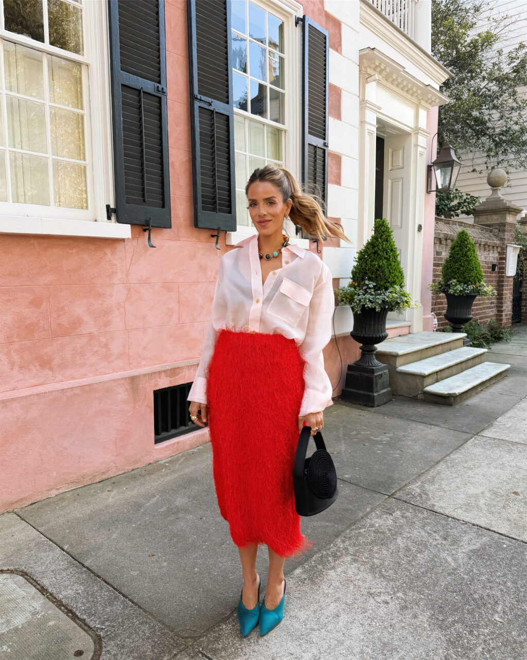 Mar 2026 Daily Look No. 100 Khaite Top (old, similar here), Dries Van Noten Skirt, Alaia Heels, Chanel Necklace, Destree Bag