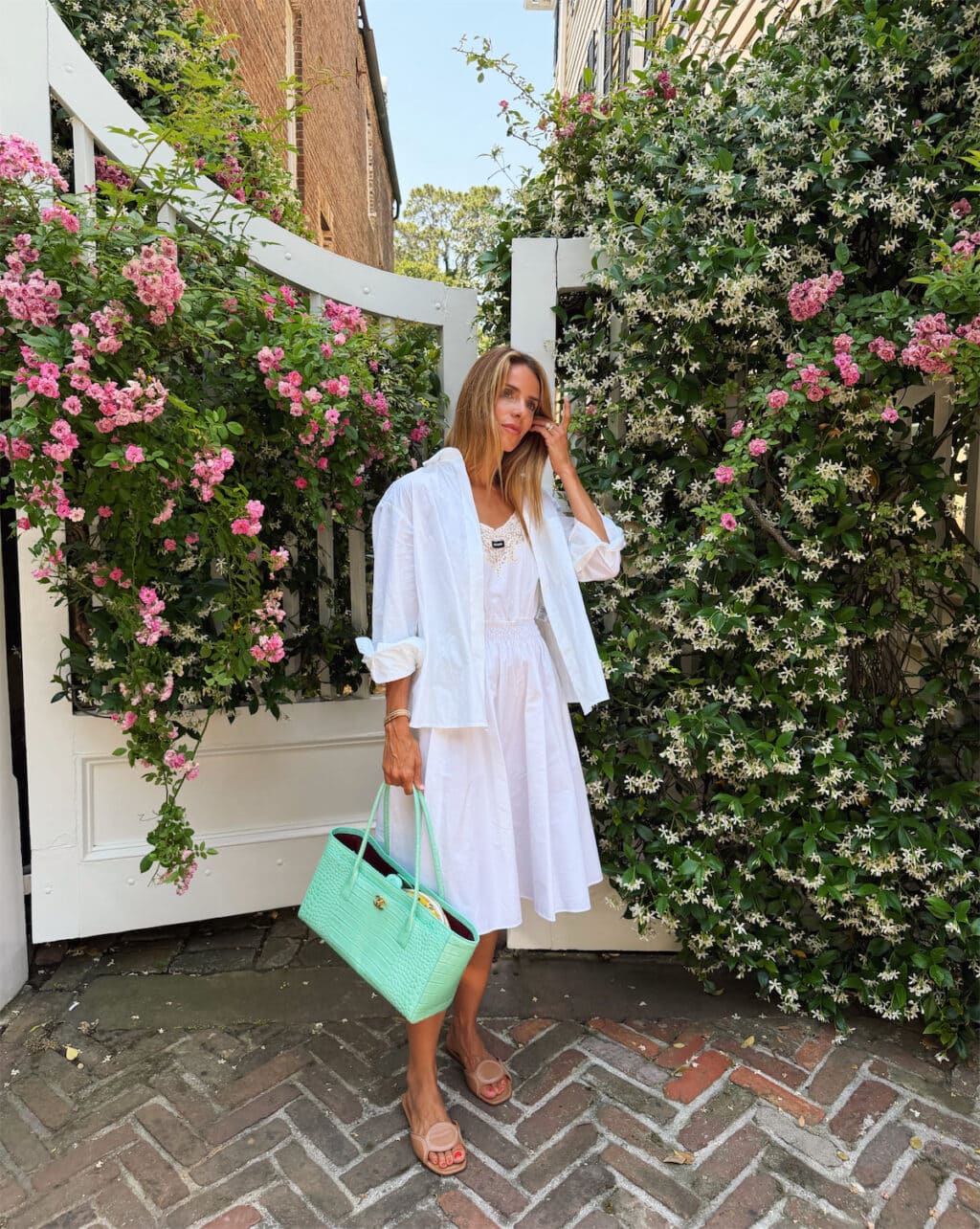 Apr 2026 Daily Look No. 139 Miu Miu Dress (old, similar here), Comme Si Shirt, Chanel Tote, Di Gaia Sandals