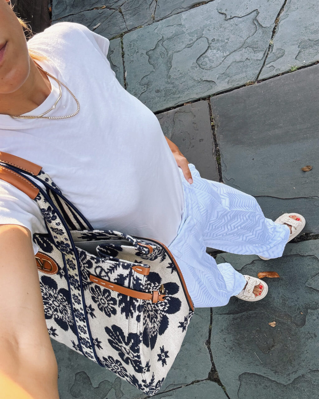 May 2025 Daily Look No. 146 The Row Tee, Missoni Pants, Chanel Sandals (similar here, less expensive here), Valentino Tote