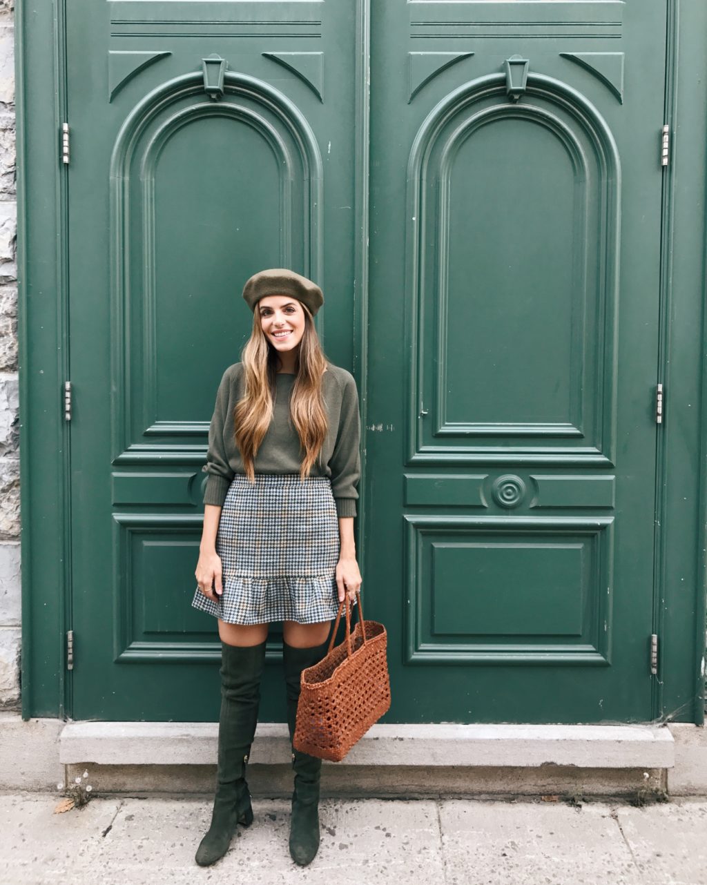 Vince Sweater, Polo Ralph Lauren Brown Suede Jacket c/o (not shown here, but worn in Insta Stories), J.Crew Skirt (size down – I’m wearing a 00), Tory Burch Boots, Dragon Diffusion Tote, Beret (similar here)