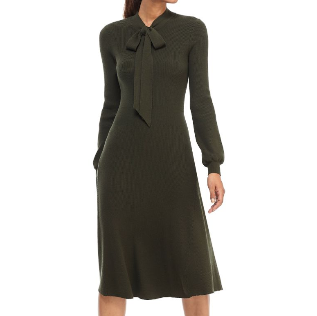 The rib knit fabric, slightly flared hem, and tie-neck detail give our Brianna dress a comfortable, but polished look. It’s one of my favorite pieces to wear straight from work to dinner.