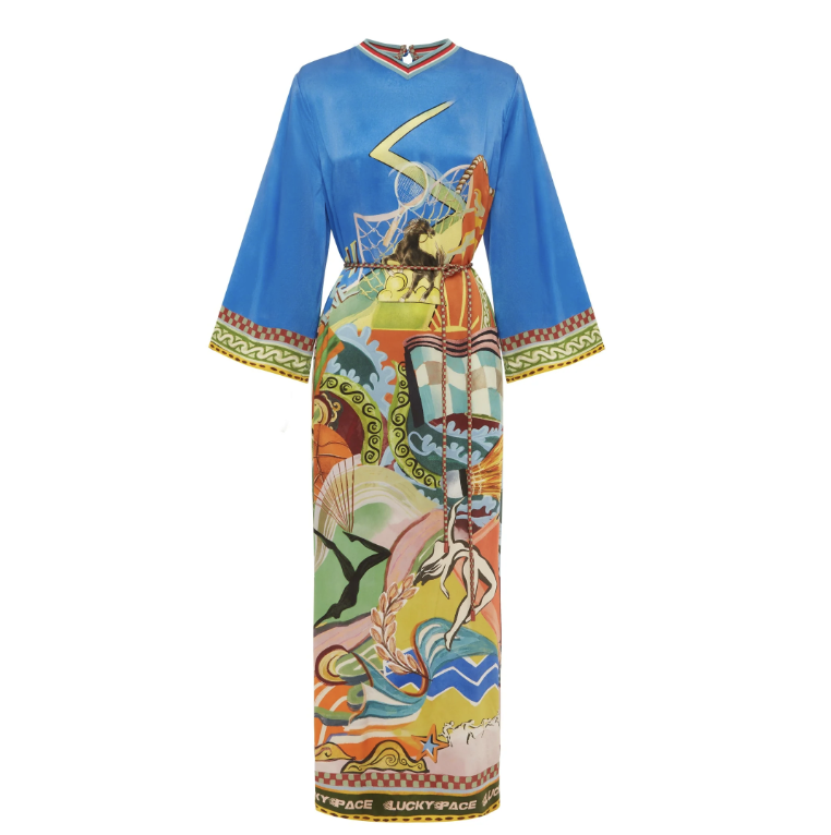 Adorned with an intricate, colorful print, this relaxed-fit silk midi dress captures the essence of Mediterranean artistry, making it a perfect choice for leisurely dinners or exploring coastal towns.