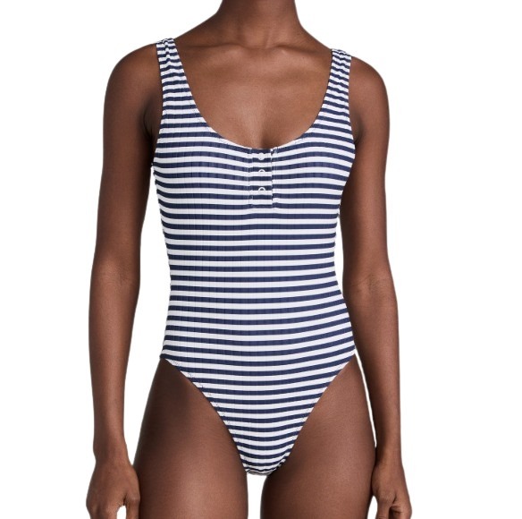 • 07.22.24 Striped One Piece Swimsuit Make a splash with this timeless striped one piece swimsuit that combines classic style with snap buttons for a modern twist, ideal for both poolside lounging and ocean dips. Previous Story Pleated Poplin Pants Next Story Faux Suede Tote Bag