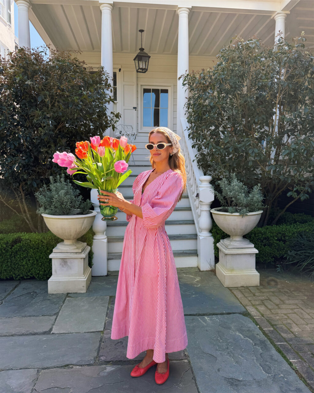 Lake Dress, Magda Butrym Scarf, Saint Lauren Sunglasses, Chanel Flats (similar, less expensive here)