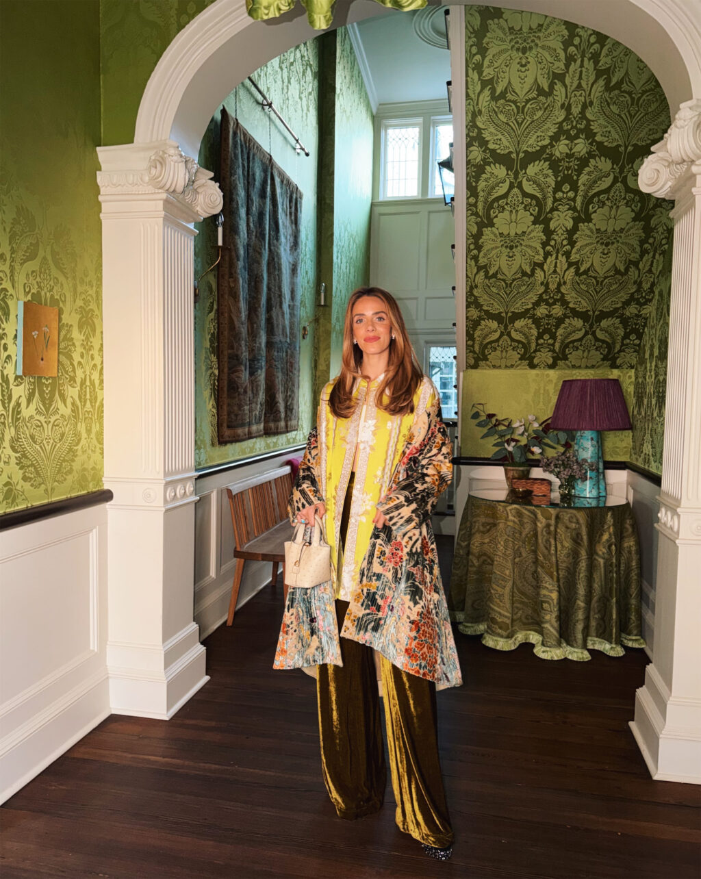 Nour Hammour Coat, Valentino Jacket & Scarf (similar here), Victoria Beckham Pants (old, similar here and here), Hermes Bag (similar here), Gigi Burris Hat, Saint Laurent Sunglasses, Khaite Gloves