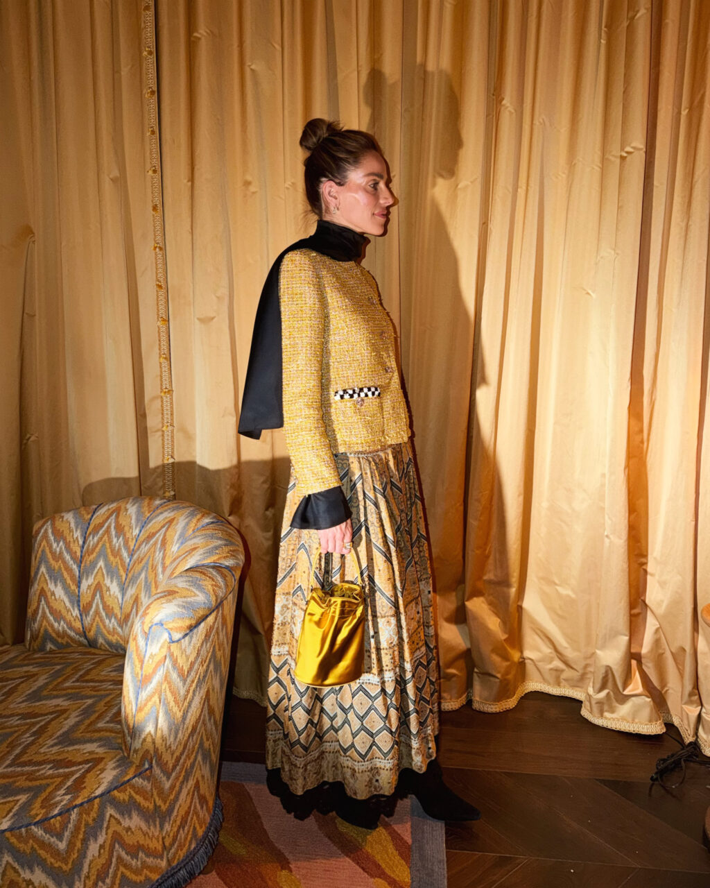 Chanel Jacket (old, similar here and here), Rohe Top (similar here and here), Ulla Johnson Skirt (old, similar here and here), Staud Bag, Tiny Gods Earrings, Jimmy Choo Boots (available here in brown)